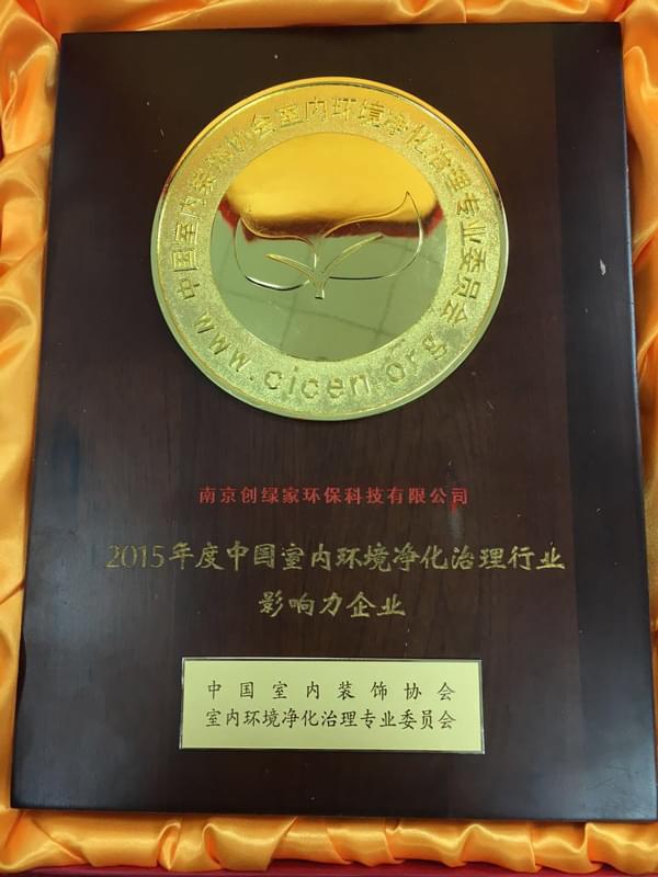 由中國室內裝飾協會室內環境凈化治理專業委員會主辦的“中國室內環境凈化治理行業技術創新論壇暨2015年凈化委工作年會”在北京召開。會上,成立了中國室內裝飾協會室內環境凈化治理專業委員會金融資本服務平臺,并確定2016年為“中國室內環境凈化治理行業體驗年”,中國室內裝飾協會室內環境凈化治理專業委員會將推動行業公益項目和企業獨立公益項目的進程。會上授予南京創綠家環保科技有限公司2015年度中國室內環境凈化治理行業影響力企業榮譽稱號!